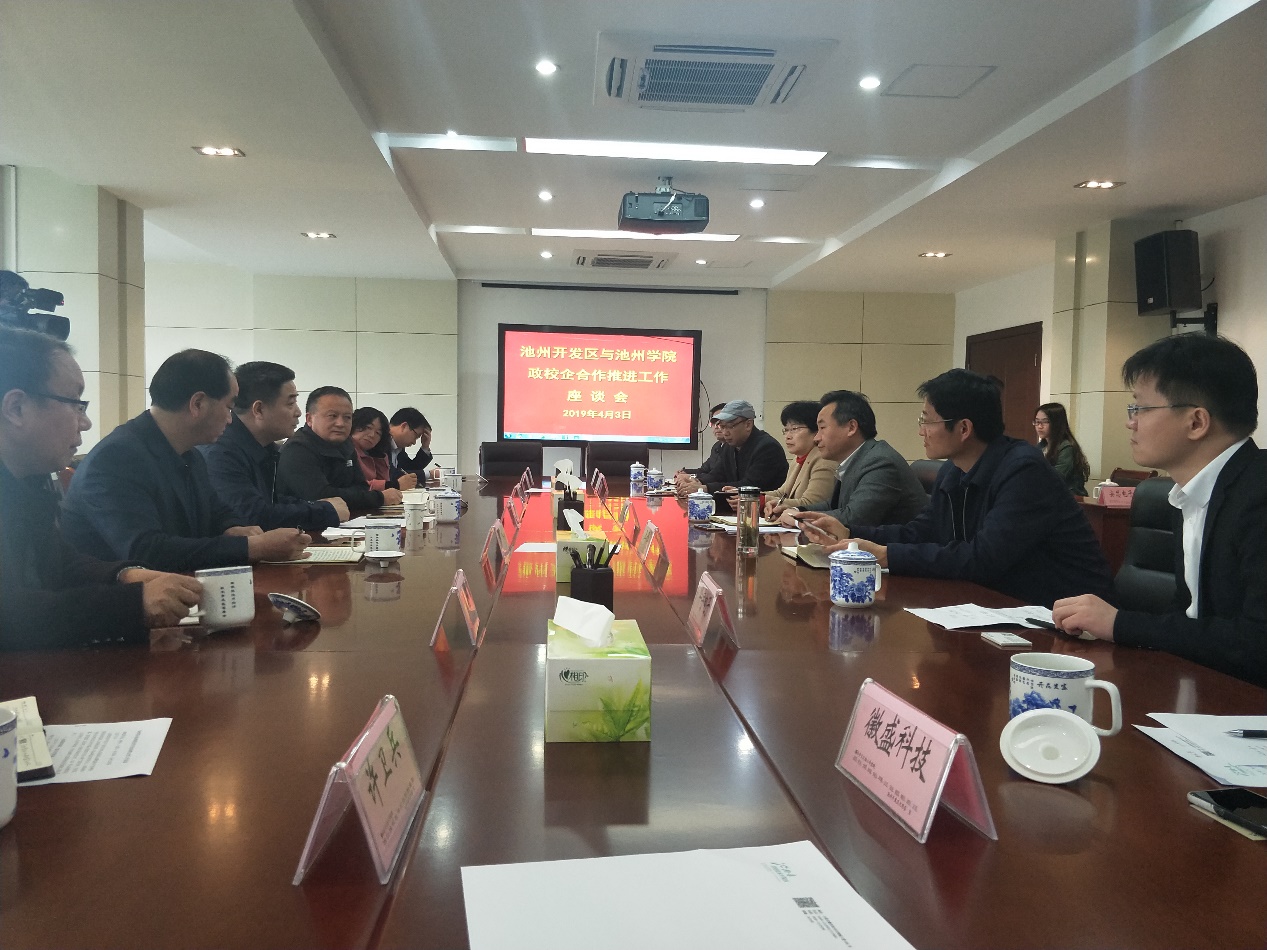 4月3日下午,校长柳友荣前往池州经济技术开发区洽谈校政企合作事宜。开发区党工委书记、管委会主任程国清热情接待并进行座谈。副校长阳光宁参加活动。