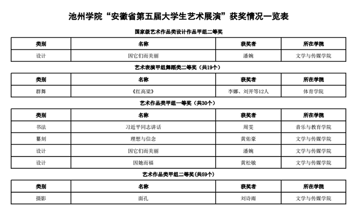 近期,安徽省第五届大学生艺术展演活动评选结果揭晓,beat365官网获奖颇丰,共有各类奖19项,其中艺术作品类荣获一等奖6项,二等奖1项,三等奖3项;艺术表演类二等奖1项;艺术论文类二等奖2项,三等奖3项;高校校长书画摄影作品校长风采奖3项。尤其是文学与传媒学院潘婉同学创作的设计类甲组作品《因它们而美丽》荣获国家级二等奖(指导教师:魏鸿飞)。另外有8人荣获优秀指导教师奖。