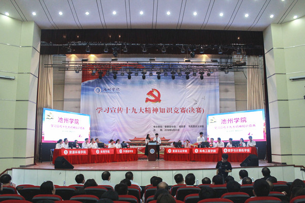 为深入学习宣传贯彻党的十九大精神,践行新思想,拥抱新时代,5月23日下午,由校党委宣传部、校团委、马克思主义学院联合举办的学习宣传十九大精神知识竞赛(决赛)在博古礼堂圆满落幕。校领导柳友荣、孙晓峰、王延寿、阳光宁、汪贤才出席并观看了比赛。