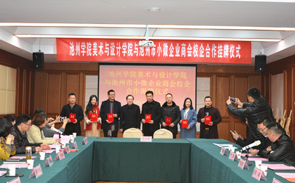 118日上午,美术与设计学院与池州市小微企业商会校企合作揭牌仪式在池州市天水湾大酒店四楼会议室举行。校党委副书记孙晓峰出席活动仪式,并为校企合作揭牌,教务处、学生处、美术与设计学院有关负责人,小微企业商会负责人和部分教师参加。