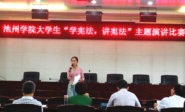 比赛过程中,7位参赛选手依次出场,他们从多个角度阐述自己所理解的宪法与法治精神。演讲精彩纷呈,高潮迭起。经过激烈的角逐,来自15级学前教育2班的秦甲丽获得了本次比赛一等奖,并将代表学校参加省级比赛。