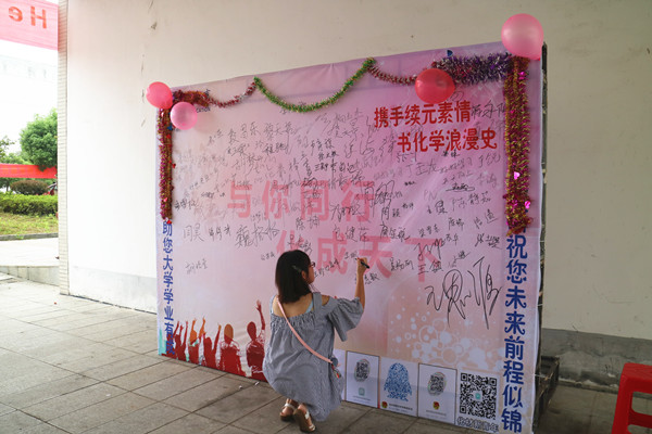 音乐与教育学院不单设计了签名墙,还准备了寄语墙和照片墙,让报到新生写下自己对未来大学生的展望和规划。旅游与历史文化学院专门辟出教室作为家长休息室,并发挥专业特长,为新生讲解校园建筑文化。