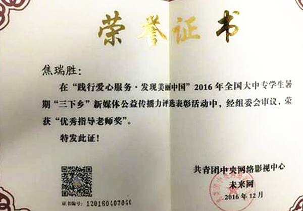beat365官网体育学院教师焦瑞胜由于在全国大中专学生志愿者暑期文化科技卫生大学生“三下乡”实践活动中表现优异,获得了“践行爱心服务发现美丽中国”2016年全国大中专学生暑期“三下乡”的“优秀指导老师奖”。