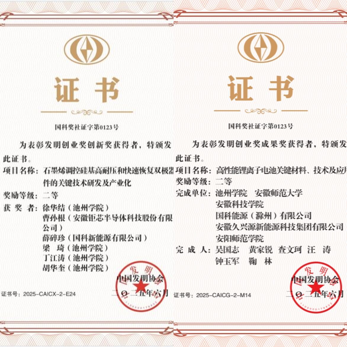 “高性能锂离子电池关键材料、技术及应用项目”获成果奖,本项目突破传统电极材料局限,基于3D石墨烯限域反应与原位转化技术,开发出Fe₂O₃、MoS₂、NiS等石墨烯复合微纳米负极材料,显著提升电池比容量与循环稳定性。正极材料方面,创新采用特殊结构有机磷源,构建纳米磷酸盐体系,结合原位碳包覆与离子掺杂技术,优化了材料导电性与低温性能;并通过微纳结构精准调控,实现了比容量与倍率性能的高效平衡。相关技术已在国科能源、久兴源新能源等企业实现产业化应用,取得经济效益与社会效益双丰收。