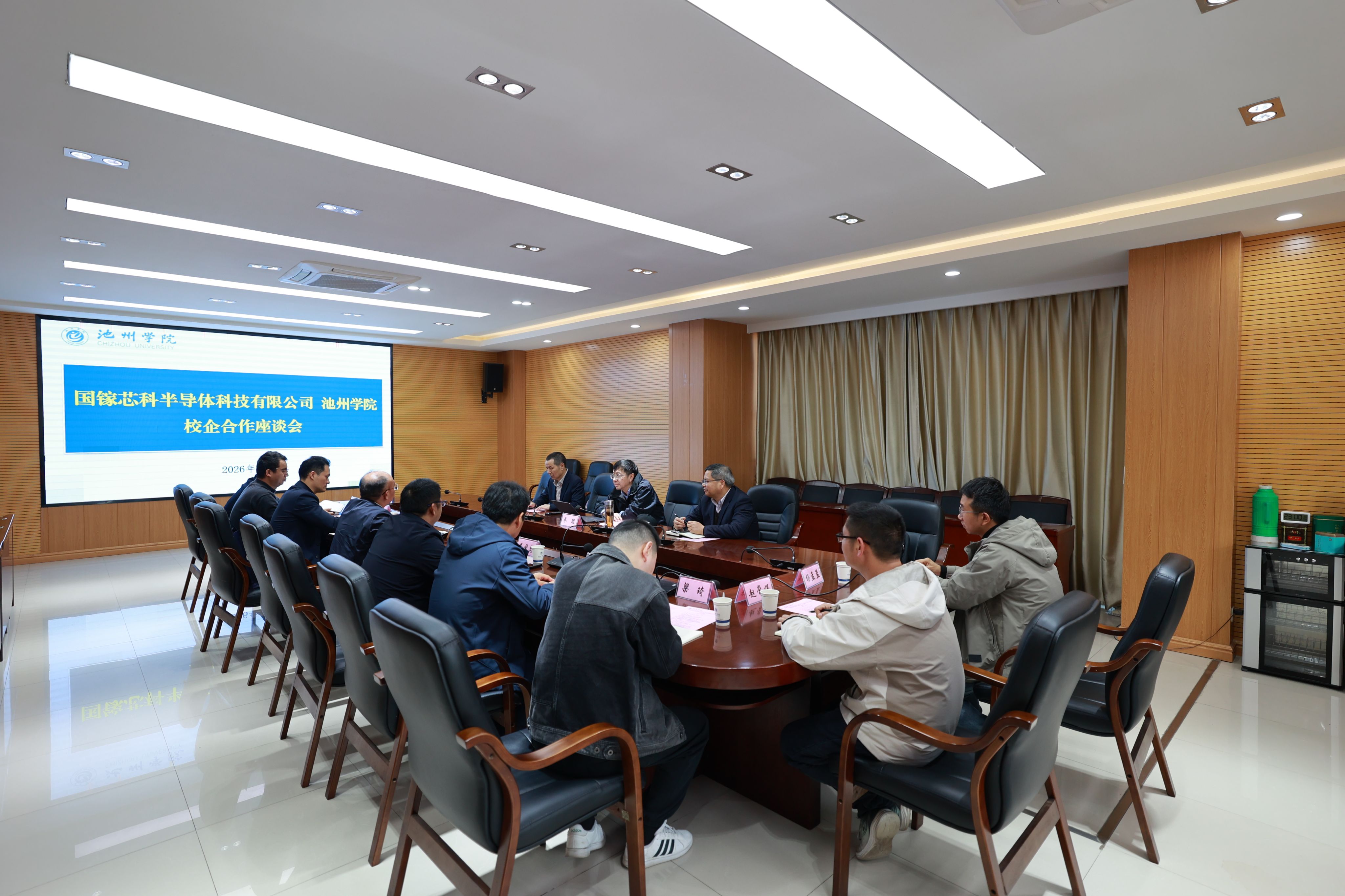 4月1日下午,学校与国镓芯科(池州)半导体科技有限公司在办公楼北二会议室举行校企合作座谈会。池州市人大常委会原副主任樊泽明,国镓芯科(池州)半导体科技有限公司董事长乔琨、副总经理杨斌华出席会议。校党委副书记、院长王先柱主持会议。