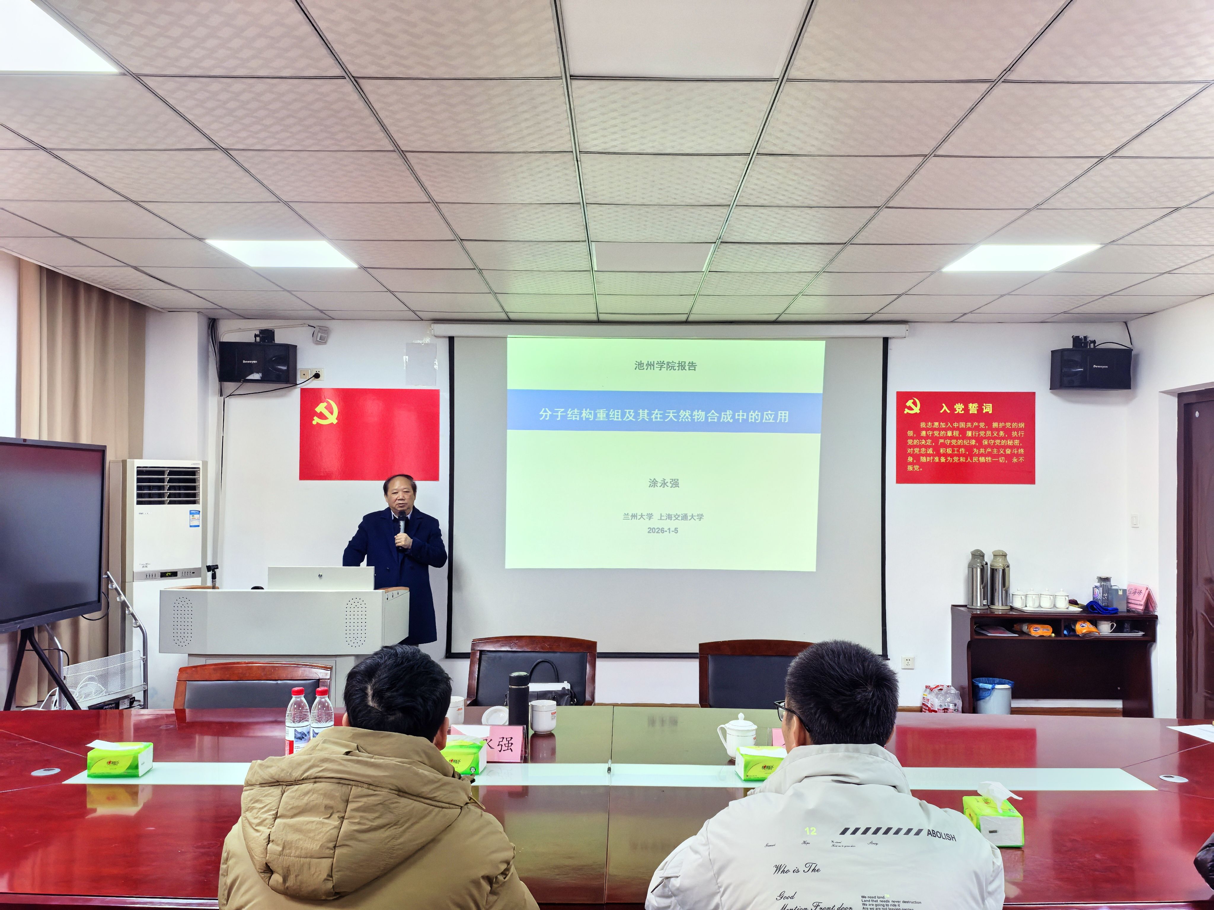 1月5日上午,beat365官网材料与环境工程学院“党建引领发展 学术促进成长”学术大讲堂在逸夫南楼会议室举行。兰州大学与上海交通大学双聘教授涂永强院士应邀作题为“分子结构重组及其多环萜类天然产物合成”的学术讲座。讲座由校党委委员、副院长李明玲主持。