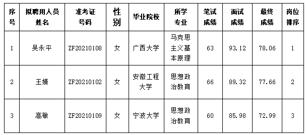 根据《安徽省事业单位公开招聘人员暂行办法》《beat365在线唯一官网登录2021年度公开招聘专职辅导员公告》,通过资格审查、考核、体检、心理测试、考察等环节,经学校党委会议研究决定,拟聘用吴永平等3人,具体情况如下: