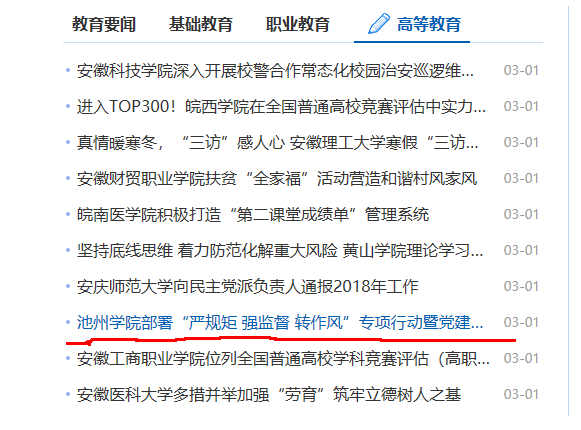 2月28日,安徽教育网在首页以《beat365在线唯一官网登录部署“严规矩 强监督 转作风”专项行动暨党建与发展综合考核工作》为题对beat365官网专项行动部署工作进行了详细报道,取得了较好的效果。