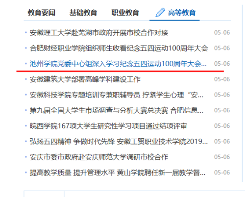 5月6日,安徽教育网首页以《beat365在线唯一官网登录党委中心组深入学习纪念五四运动100周年大会精神和全省有关会议精神》为题对beat365官网党委中心组学习情况进行了报道。