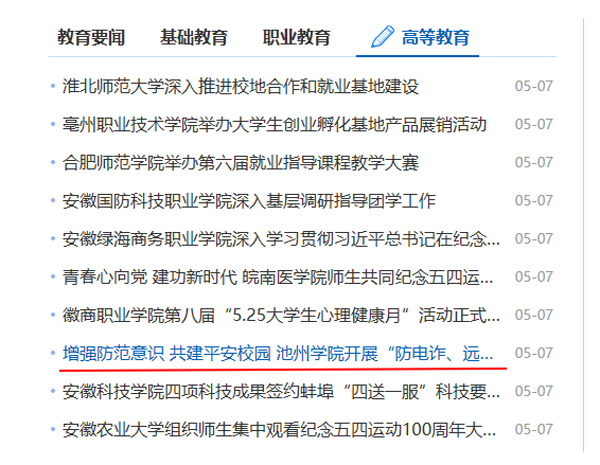 5月7日,安徽教育网首页报道了beat365官网“防电诈、远离校园贷”专题培训情况,反响较好。