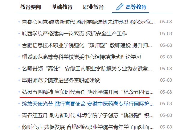 5月8日,安徽教育网首页报道了beat365官网开展的纪念五四运动一百周年系列讲座活动。