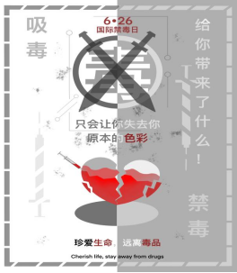 活动以禁毒海报设计主题形式,宣传了毒品的危害、毒品的有关知识以及国家有关禁毒的法律法规。本次活动以设计海报的形式让广大学生认识到了毒品不仅危害个人和他人健康、危害社会、还会毁灭家庭,让“珍爱生命,远离毒品”理念深入人心。