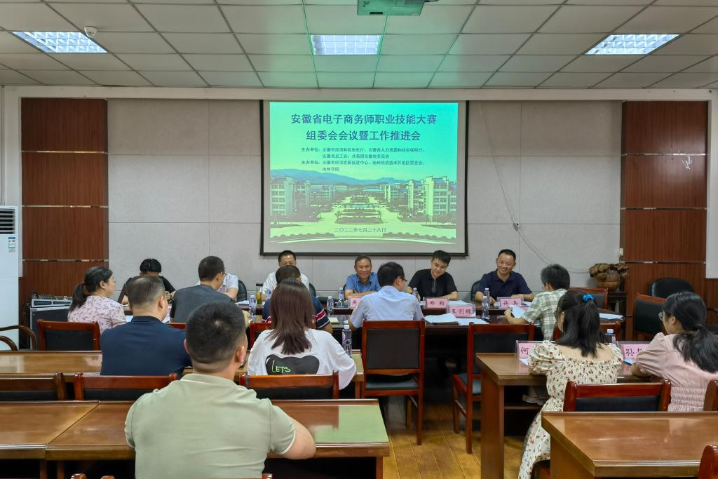 7月28日上午,安徽省电子商务师职业技能大赛组委会会议暨工作推进会在商学院博识楼二楼会议室召开。省经济发展促进中心副主任燕永,beat365在线唯一官网登录教务处处长陈建兵,池州经济开发区党群工作局副局长林中顺,省经济发展促进中心技能科科长郑翔,beat365在线唯一官网登录教务处副处长周恺,beat365在线唯一官网登录教务处实践教学科科长朱德权,赛事服务单位安徽众智人力资源服务有限公司、合肥京东云计算有限公司主要负责人,商学院各专业教研室主任及骨干教师参加会议。