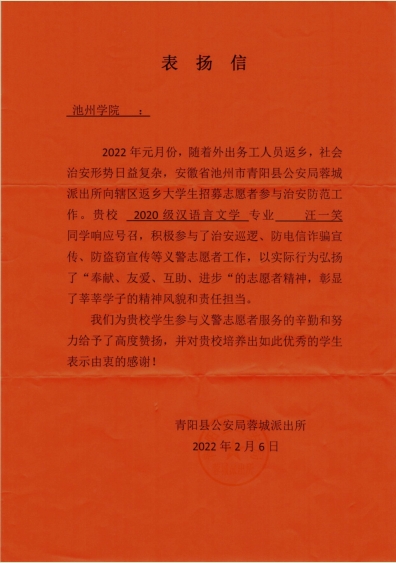2022年1月寒假期间,文学与传媒学院2020级汉语言文学3班汪一笑同学积极响应池州市青阳县公安局蓉城派出所招募志愿者的号召,参与了治安巡逻、防电信诈骗宣传、防盗窃宣传等义警志愿者工作,为平安青阳建设做出了积极贡献,受到蓉城派出所通报表扬。