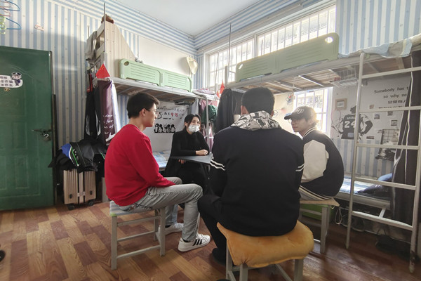 为了了解同学们的学习和生活状态,辅导员和学生面对面交流与互动,开展疫情防控主题班会,引导学生积极正确面对,不恐慌、不懈怠,在疫情防控常态下,提高自我防护的意识和能力,与同学们一起制定封闭式管理期间的学习、锻炼计划,强调适当体育锻炼的重要性,为学生讲授衣食住行里的疫情防控知识。