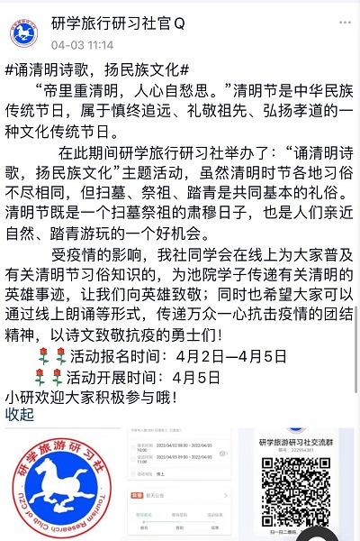 研学旅行研习社于4月5日举办了“诵清明诗歌,扬民族文化”主题活动。社团成员在线上为同学普及清明节习俗知识,为池院学子传递英雄事迹,通过线上朗诵形式,传递万众一心抗击疫情的团结精神。