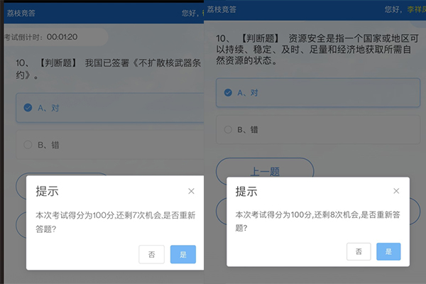 参加一次国家安全知识竞赛。为进一步夯实学生的学习成果,体育学院借助中国大学生在线平台积极鼓励学生参与国家安全知识问答,通过以赛促学的方式,全面提高学生国家安全防范意识,推动总体国家安全观深入人心。