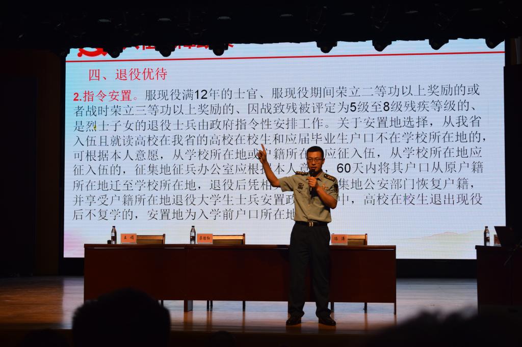 会上,冯涛分别从大学生入伍政策保障、入伍条件要求、应征程序等三个方面详细解读了大学生入伍的流程以及与学生切身利益息息相关相关的政策,并结合个人参军经历,深入浅出地讲述了入伍前后的心路历程,以此激发同学们携笔从戎,参军报国的热情,鼓励大家到祖国需要的地方,到人民需要的地方建功立业,逐梦青春,实现价值。