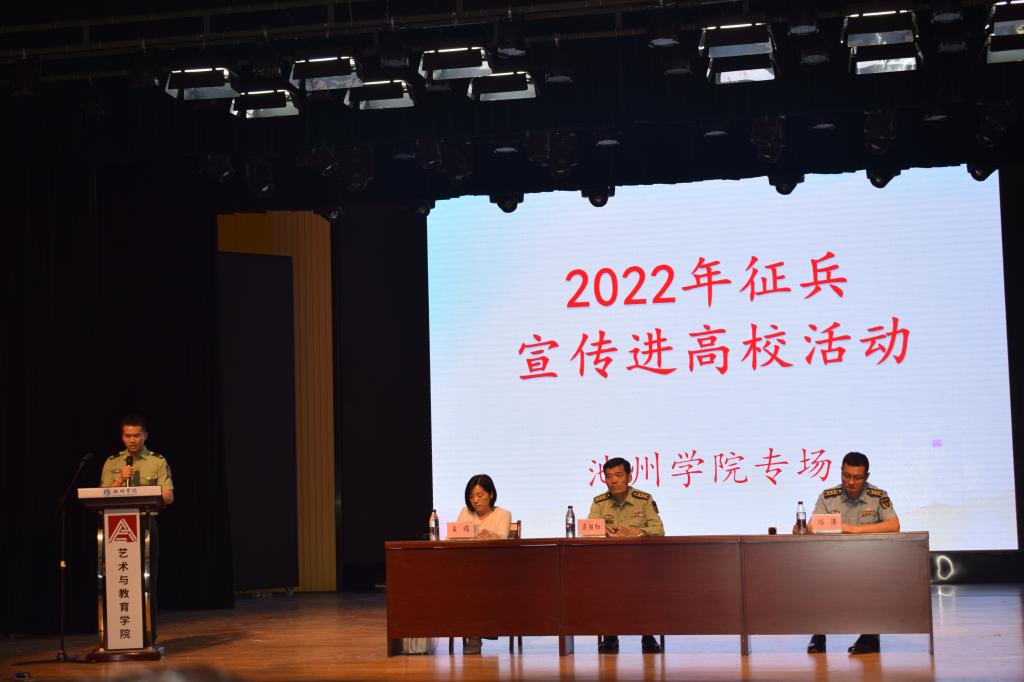 为进一步贯彻落实全省征兵工作会议精神,帮助beat365官网大学生了解、掌握应征入伍相关政策,鼓励广大适龄大学生积极报名参军。5月25日下午,beat365官网线下在艺教楼音乐报告厅,线上通过“池院易班”向金牛湖校区师生以及受疫情原因未能返校的毕业生同步开展了征兵工作宣讲活动,池州军分区动员处处长渠胜红,贵池区人武部政委冯涛应邀参加宣讲。大会由武装部副部长王娟主持。