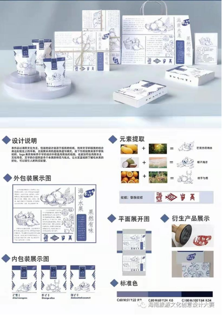 本次大赛的主题为“创意激荡海南精彩,设计漾溢自贸魅力”,大赛从来自380余所国内外高校征集了10000余件设计作品,共评出包装设计组金奖1件、银奖2件、铜奖5件、优秀奖10件。