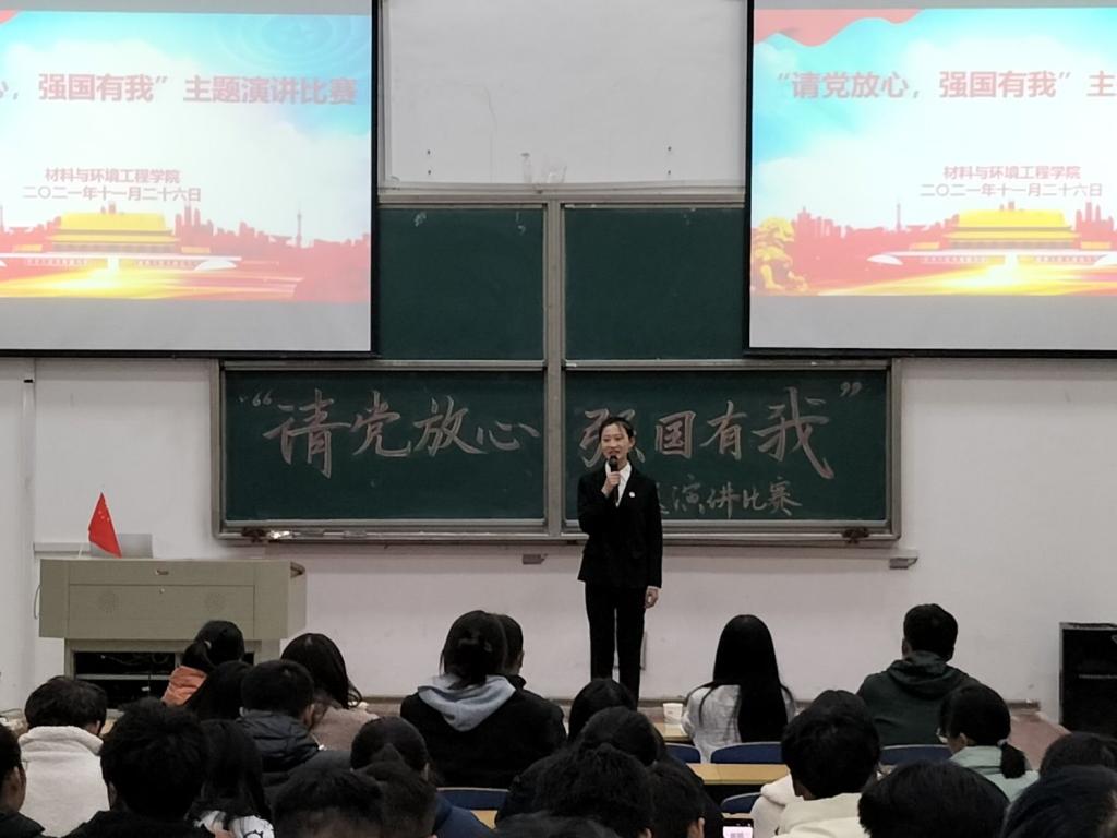11月26日晚,材料与环境工程学院于逸夫楼阶梯教室开展了“强国有我,请党放心”主题演讲比赛活动。学院党委书记何贵林、副书记刘昉,教师代表关旋、朱昭阳等应邀观摩比赛,并担任比赛评委。近200名同学观看了比赛。