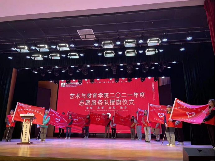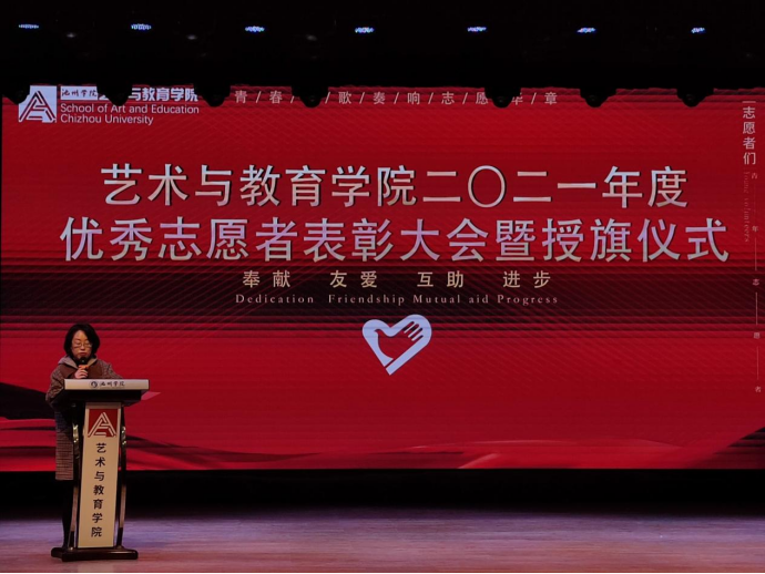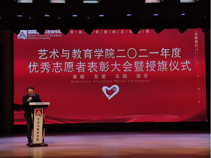 为了进一步弘扬新时代雷锋精神和志愿服务新风,培养青年大学生“关爱他人、无私奉献、立志成才”的美好品质,2021年12月1日,艺术与教育学院志愿者表彰大会暨授旗仪式在音乐厅举行。校团委副书记李旋宇、艺术与教育学院党委书记杨静、院长魏鸿飞、党委副书记周建国,院系各学生党支部书记、专职辅导员、志愿服务队指导老师出席了本次大会。大会由艺术与教育学院团委副书记刘书宜主持。