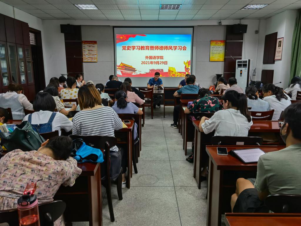 9月29日下午,外国语学院在会议室举行全体教职工大会,开展党史学习教育暨师德师风学习会。会议由外国语学院党委书记张乐民主持。