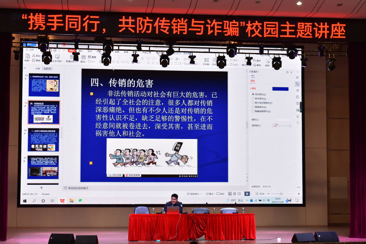 讲座中,吴警官从传销定义、传销特征、传销手段、传销危害、识别传销、远离传销、传销处置等方面对传销犯罪行为进行了深刻的剖析,又用生动的案例对电信诈骗类型和常见的手段进行了详细的介绍。吴警官强调,大学生要深化对传销和电信诈骗危害的认识,做到拒绝传销、防范诈骗,要常怀敬畏之心、常思贪欲之害、常守诚信之根、长崩警惕之弦,以避免在今后的工作和生活中上当受骗。