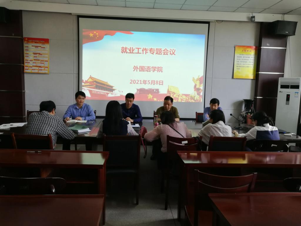 5月8日下午,外国语学院在会议室举行2021届毕业生就业专题会议。外国语学院班子、毕业班辅导员参加了会议。会议由外国语学院党委书记张乐民主持。