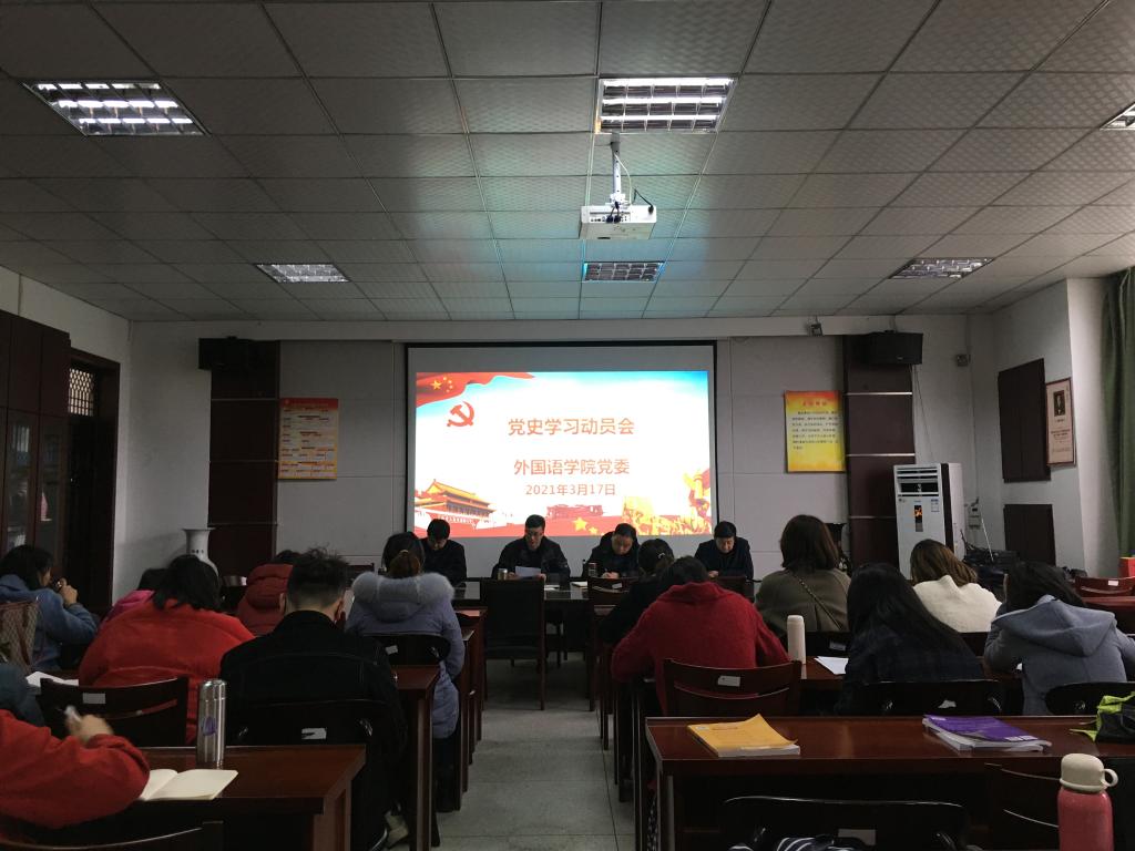 3月17日下午,外国语学院党委在会议室举行党员大会,开展党史学习教育动员。会议由外国语学院党委书记张乐民主持。