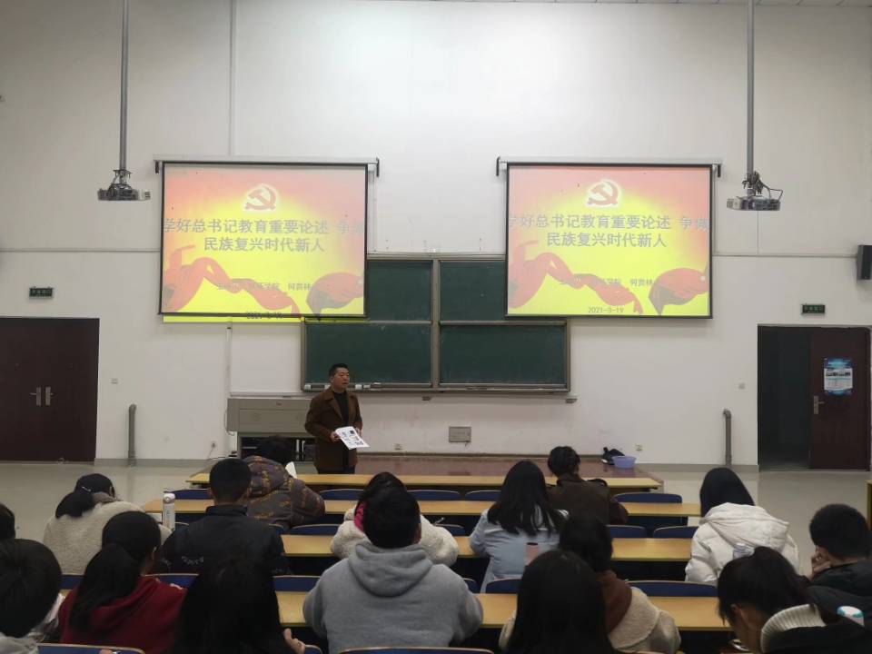 为深入学习习近平总书记在党史学习教育动员大会上重要讲话精神,提高大学生骨干的思想政治素质,2021年3月19日周五晚,材料与环境工程学院联合旅游与历史文化学院和马克思主义学院(法学院)在逸夫楼南楼阶梯教室举行了青马班课程,本次课程由材料与环境工程学院党委书记何贵林进行授课。