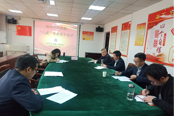 4月13日下午,材料与环境工程学院开展首届“九威”专业奖学金评选活动,学生处副处长吴继承、池州九威新材料有限公司总经理郭建军、材环学院党委书记何贵林、材环学院副院长汪鹏飞等参加了评选活动,评选活动由高分子教研室主任周瑾主持。