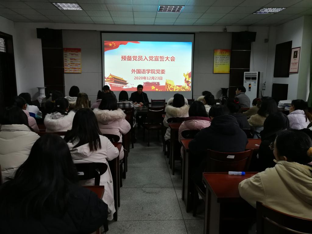 12月23日下午,外国语学院在会议室隆重举行预备党员入党宣誓活动。外国语学院党委书记张乐民、各支部书记和新入党的42位预备党员参加了此次活动。会议由外国语学院党委副书记刘军主持。