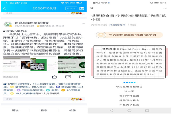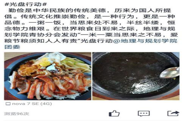 为坚决贯彻落实习近平总书记关于制止餐饮浪费行为的重要指示精神,培养师生良好的健康饮食习惯,教育师生厉行节约、反对浪费,弘扬勤俭节约、艰苦奋斗精神,营造浪费可耻、节约光荣的良好氛围,地理与规划学院通过学院主页、两微一端、LED屏、电子倡议书、线上宣讲、“光盘行动”等多渠道的宣传,在全院扎实开展了“厉行节约、反对浪费”系列主题教育活动,取得了较好的效果。