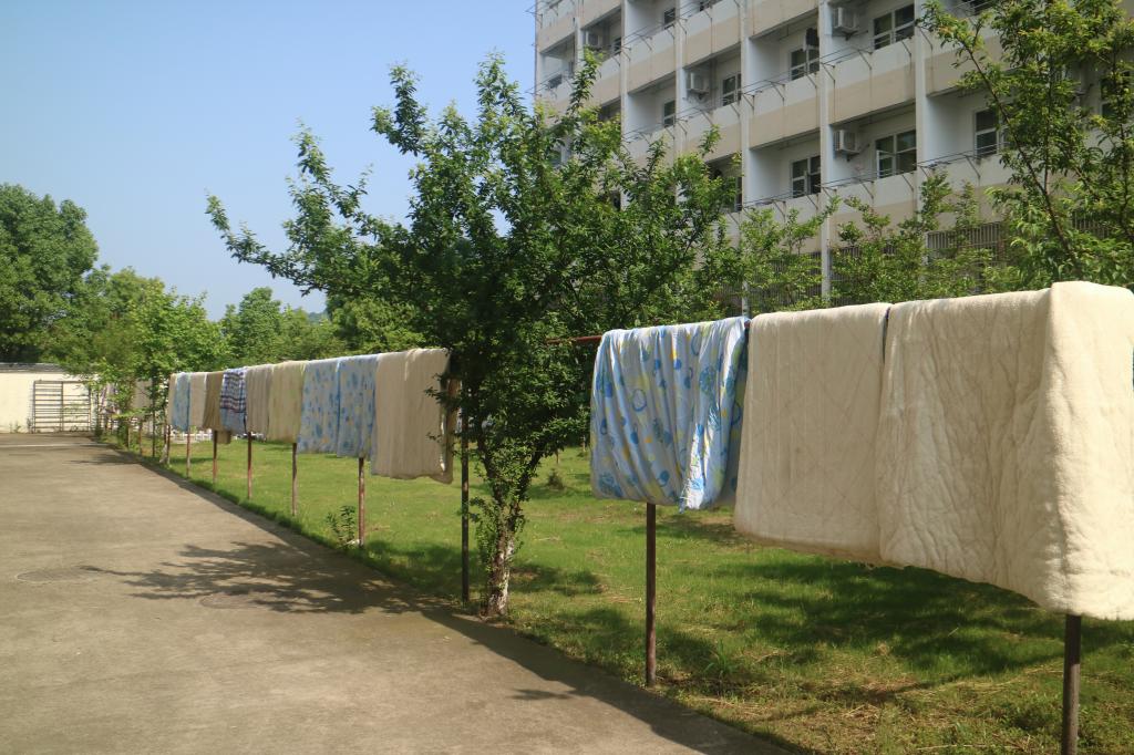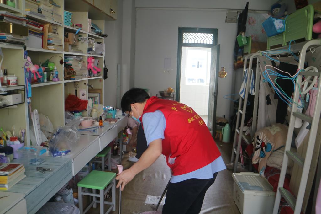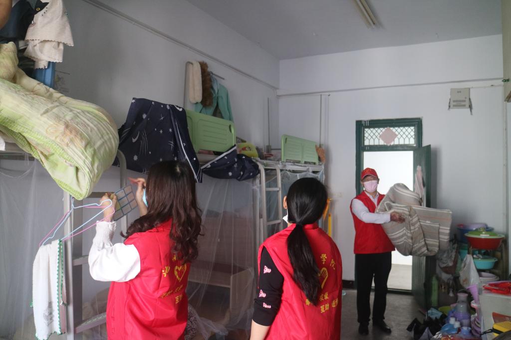 参加活动的党员教职工为学生打扫卫生、整理床铺、清理垃圾、打包邮寄物品,大家还细心的按照寝室门牌号和床位号为被子做了标签,将被子一 一拿出去晾晒。