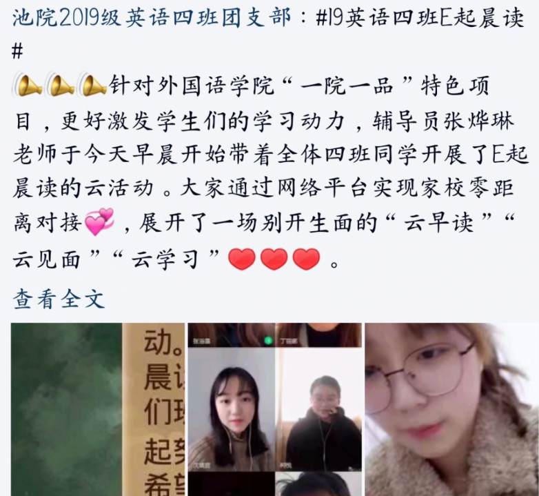 为在疫情期间继续推进“一院一品”学风建设项目“阳光晨读 语绎青春”、坚持外国语学院优良学风传统、让学生在特殊时期延续晨读好习惯,外国语学院充分利用网络平台开展“E起晨读”云活动。19级英语4班是本学期转专业组建的班级,为让同学们养成良好的外语学习习惯、跟上同年级学生学习步伐,该班辅导员张烨琳组织全班学生每天坚持开展E起晨读云活动。运用网络平台,通过划分云小组隔屏轮流朗读、主题讨论、阅读文章等形式,实现家校零距离对接,有效促进良好的诵读氛围以及学风的形成,丰富学生的云生活。