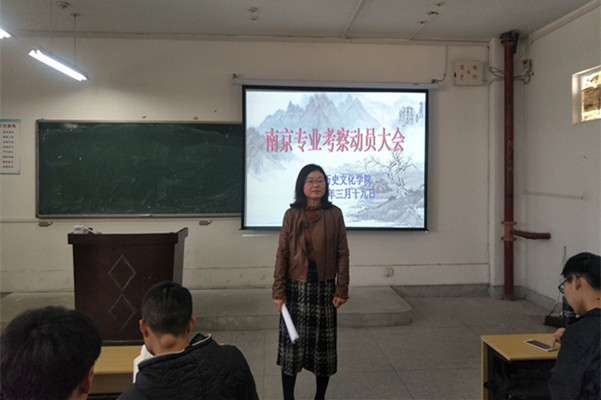 旅游与历史文化学院制定了《旅游与历史文化学院南京专业考察实施方案》、《旅游与历史文化学院专业考察文明规范》、《旅游与历史文化学院专业考察报告撰写规范》、《南京专业考察学生安全承诺书》,并成立了以胡惠芳副院长为组长的考察领导小组。学院召开了全体学生和指导教师动员大会,胡惠芳副院长出席动员大会并讲话。她强调,专业考察要有专业意识、安全意识、纪律意识和文明意识并对指导教师做出了具体明确的要求。