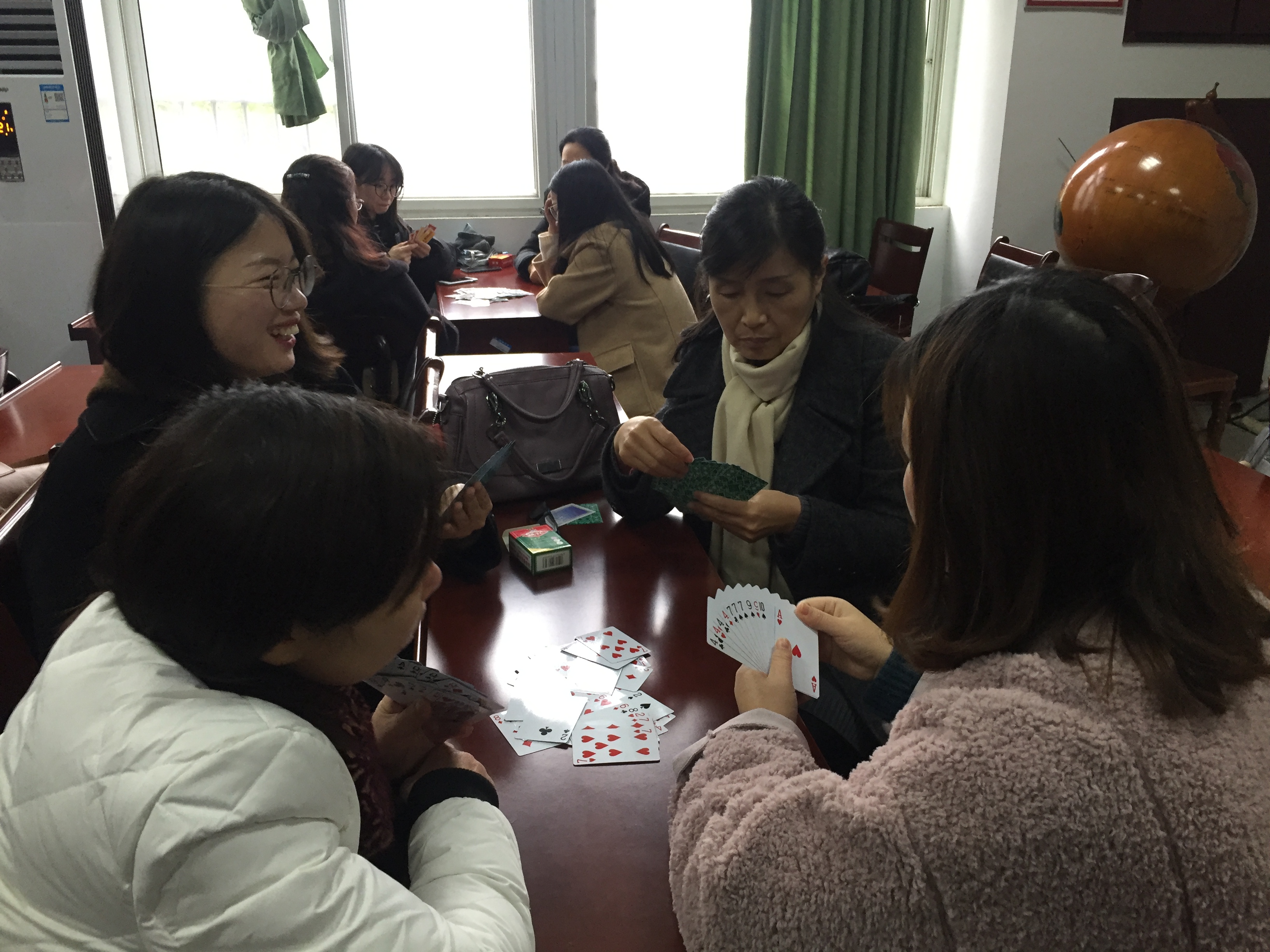经过抽签,参赛选手们在外国语学院工会小家和会议室进行了比赛。比赛中参赛搭档通力合作、默契配合,充分施展自己的牌技,斗智斗勇。牌局比分你追我赶,有遥遥领先又马失前蹄的,也有开局不利后来居上的,但无论胜负,大家均是喜笑颜开,观战者也是其乐融融。经过五轮较量,丁小凤、邱小玲组获得冠军。