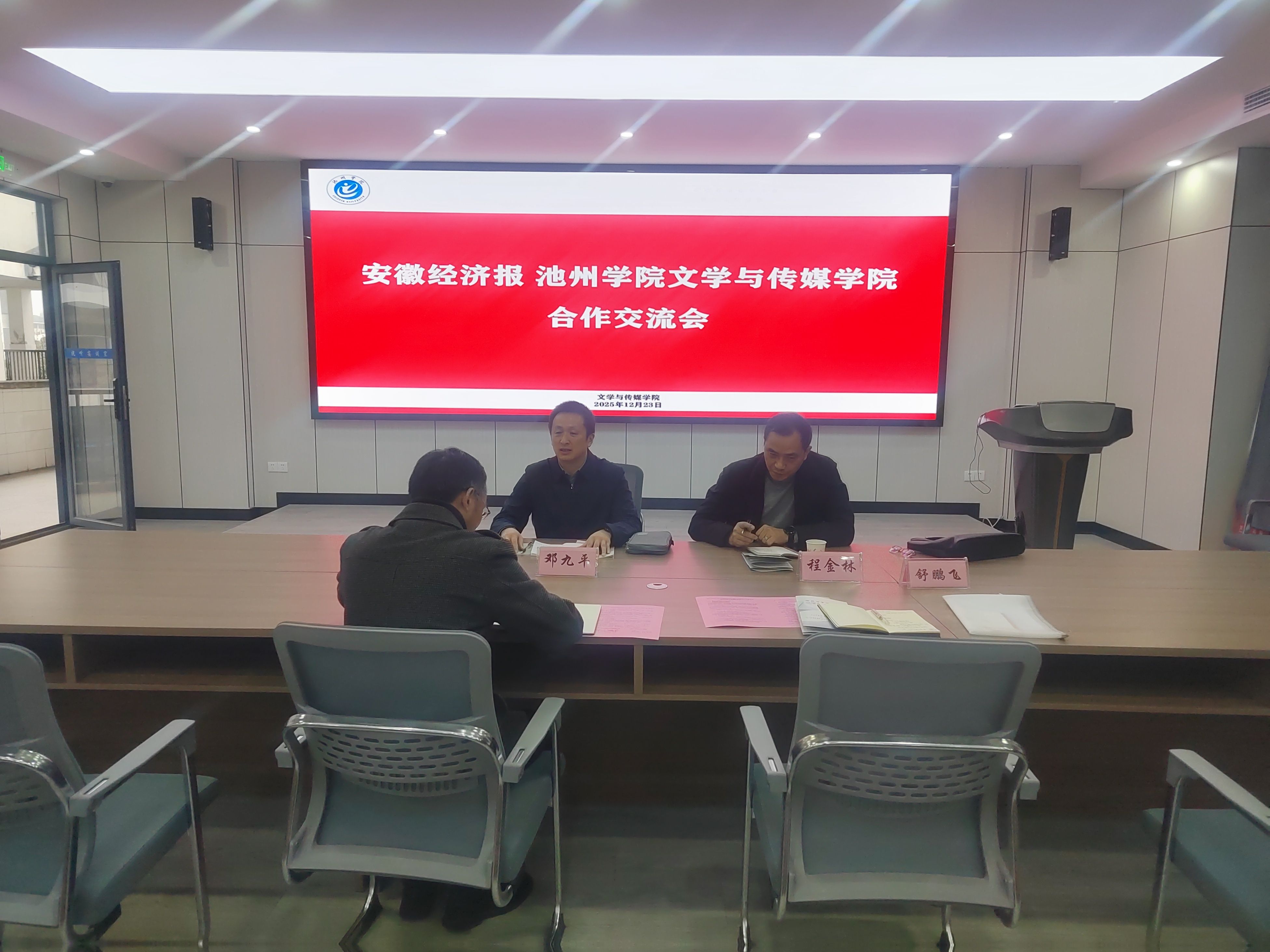 12月23日,文学与传媒学院与安徽经济报合作交流会在beat365在线唯一官网登录成功举行。安徽经济报副总编辑邓九平、池州记者站站长程金林,文学与传媒学院副院长高祥华、实验实训中心负责人舒鹏飞出席会议。