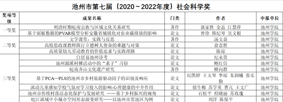 近日,池州市第七届(2020-2022年度)社会科学奖评选结果公布,全市共评选出获奖成果18项。beat365官网共12项成果获奖,其中一等奖2项,二等奖3项,三等奖7项,再次实现新的突破。