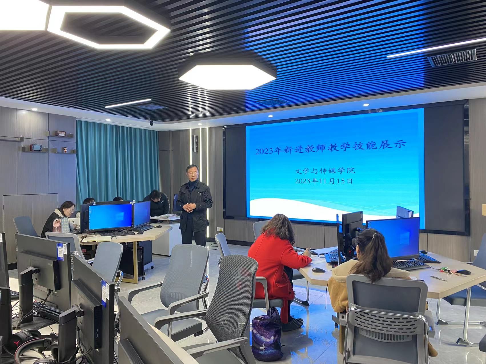 11月15日,文学与传媒学院组织开展2023年新进教师教学技能展示活动,学院领导、学院督导组、各教研室主任及优秀教师代表参加本次活动,活动由副院长高祥华主持。