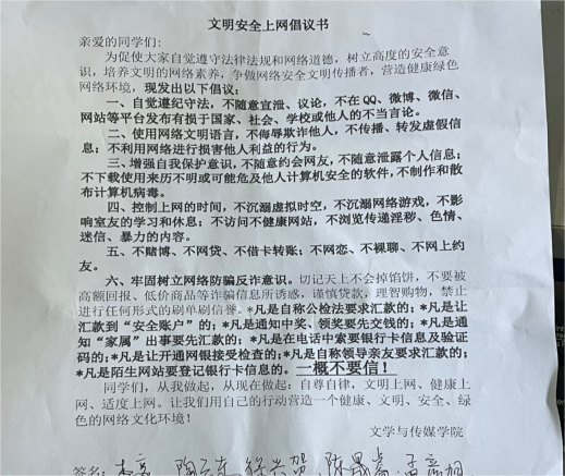 学院还通过强化安全信息宣传员队伍建设,制作“文明安全上网”宣传展板,推进文明安全知识进党课、融入黑板报评比、融入课堂思政等形式,不断规范大家的网络空间言行,提升大家的网络法律意识和安全防范意识。