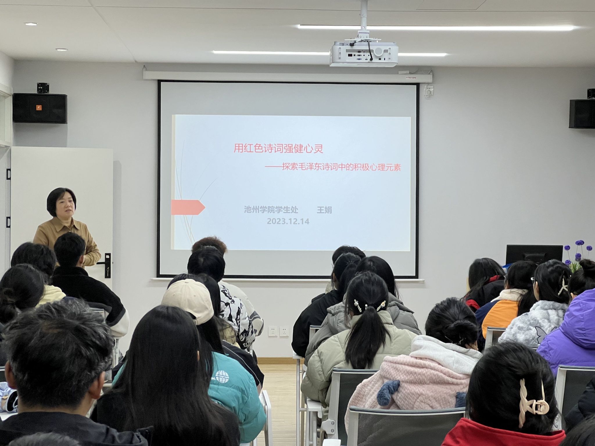 为激励beat365官网青年学子从红色文化中获取灵感和力量,促进大学生心理健康水平的提升和心理健康素质的培养,根据beat365在线唯一官网登录第二十二届大学生心理健康宣传月活动安排,12月14日晚,学生工作处副处长王娟在心理健康教育中心以“用红色诗词强健心灵——探索毛泽东诗词中的积极心理元素”为主题,为现场师生带来一场主题鲜明、积极向上的文化育人专题讲座。
