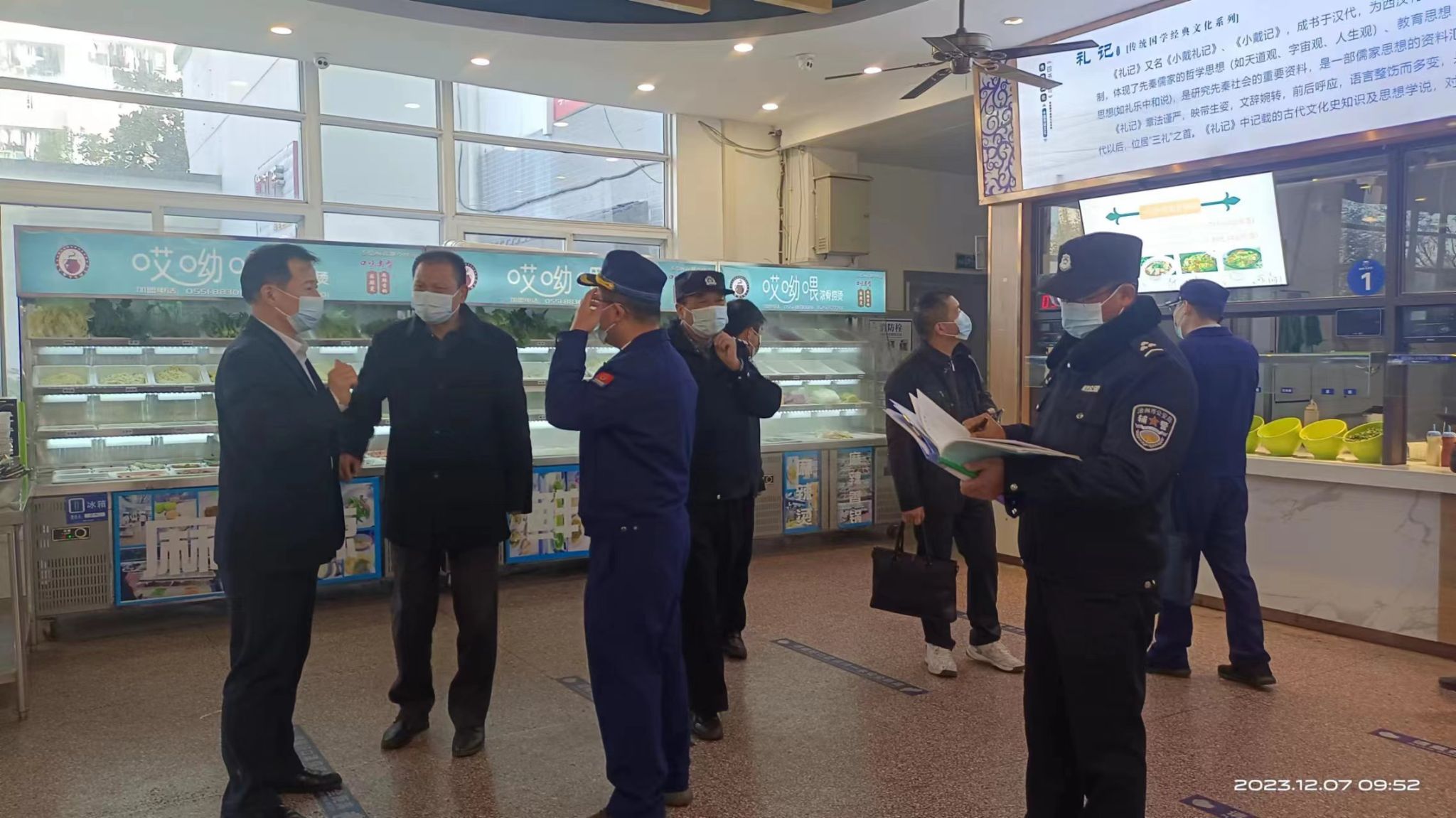 保卫处、后勤管理与基建处负责人及校警务站民警、食堂、学生公寓外包服务公司、消防维保单位有关人员陪同参加检查。