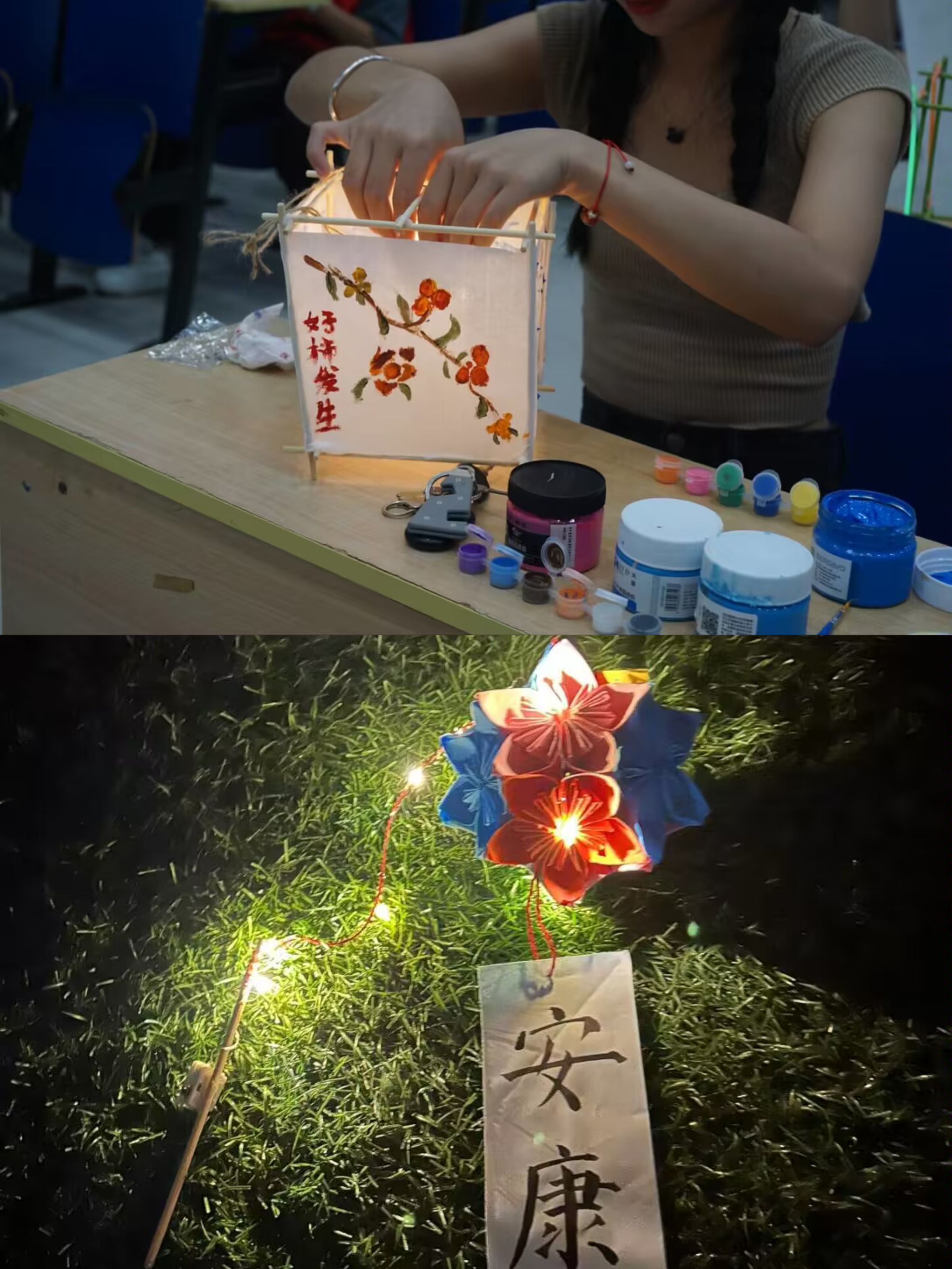 “花灯邀明月 巧手迎中秋”主题活动现场,同学们学习花灯的历史、花灯的结构以及制作过程,自行组合、齐心协力开始制作形式多样、带着美好祝愿的花灯。同学们拿着各自的花灯来到操场围坐一圈,赏花灯吃月饼,并尽情展示各自的才艺,操场一片欢声笑语。“虽然离家远,无法与家人团聚,但是能感受到学院浓浓的关爱,并且学会了自己制作漂亮的花灯,今天过了一个非常有意义的中秋节”来自河南省的23级环境工程2班李姗珊同学高兴的说。