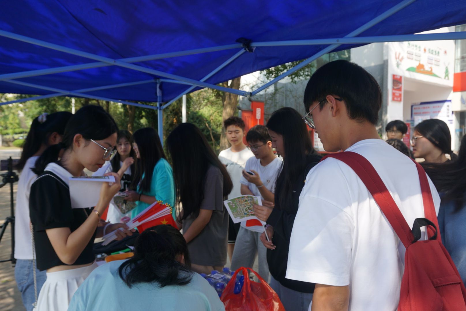 “盛世华诞 举国同庆”主题活动现场,同学们拿着小国旗开始了校园健步“寻宝”活动。在“猜字谜”这个环节中,同学们积极发挥自己的想象力,从汉字的形状、读音和含义等方面进行猜测,感受着汉字的奇妙和传统文化的韵味。在“我为祖国送祝福”环节,同学们展开祝福的纸张,诉说着对祖国最美好的祝愿。同学们用游戏中获得的国旗贴纸参加套圈游戏,兑换自己心仪的奖品。来自甘肃省23级高分子1班郑宁宁同学说:“虽然没回家,但是有爱的地方就是家,学校及学院给我们准备了很多非常有意义也有趣味的活动,让我们国庆留校也精彩!”