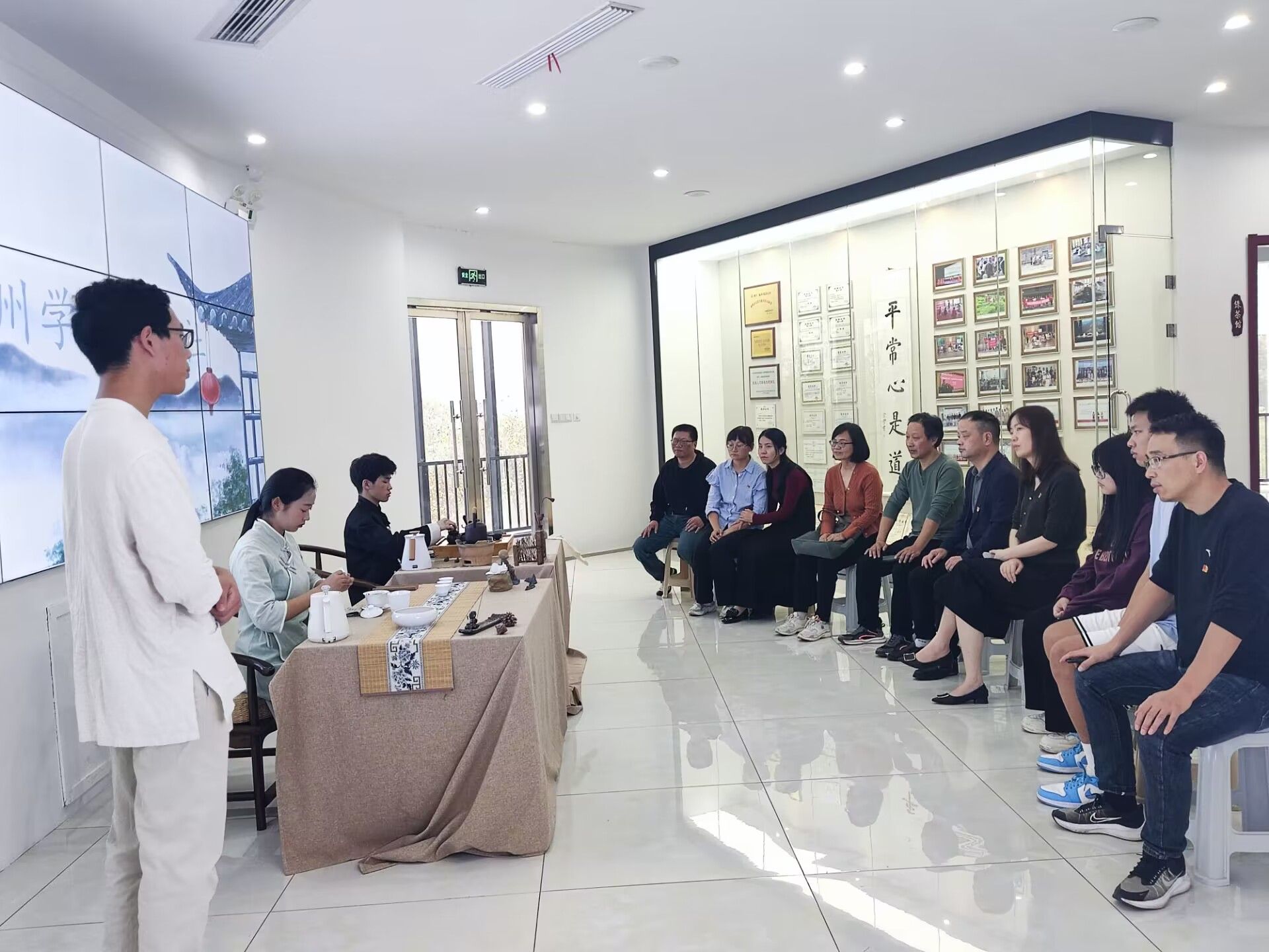 全体党员同志首先认真学习《学习时报》刊登的“深入学习习近平文化思想”文章,仔细参观了各茶艺室,聆听茶艺社指导教师尹文汉教授对茶文化的讲解。随后,茶艺社同学们为全体党员展示了茶道各流程,党员同志们通过看、听、闻、品,感受中国茶文化的博大精深。