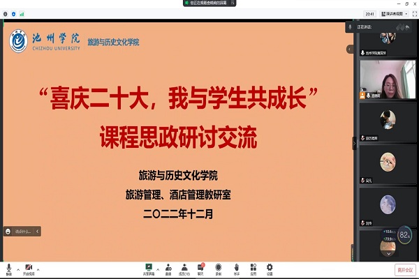 喜庆二十大、我与学生共成长:为深入学习贯彻党的二十大精神和习近平总书记在学校思想政治理论课教师座谈会上的重要讲话精神,12月14日,学院组织各教研室开展“喜庆二十大,我与学生共成长”课程思政研讨交流会,与会的人员选取所授的具体课程,围绕学深悟透党的二十大精神、推进党的二十大精神融入课程思政、推动课程思政一体化建设等主题进行交流研讨,以实际行动落实新时代立德树人的根本任务。