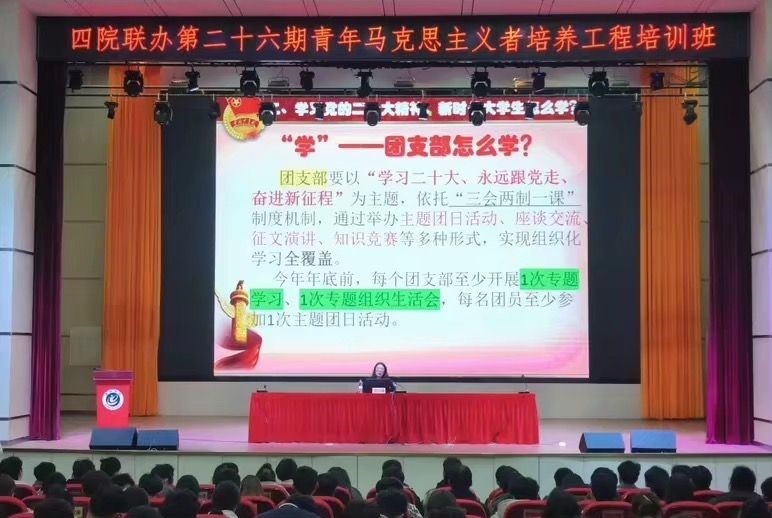 为深入学习贯彻习近平新时代中国特色社会主义思想和党的二十大精神,认真贯彻落实习近平总书记关于青年工作的重要思想,加强对青大学年生的思想政治引领,地理与规划学院、机电工程学院、材料与环境工程学院和旅游与历史文化学院于2023年3月1日晚在博古礼堂联合举办了第二十六期青年马克思主义者培养工程培训班,校团委书记程海峰、地理与规划学院党委负责人许卫兵、机电工程学院党委负责人冯淑慧、旅游与历史文化学院党委副书记杨祖勇、材料与环境工程学院党委副书记刘昉应邀出席开班仪式。