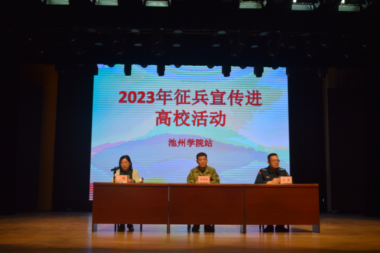 为扎实做好大学生征兵工作,帮助广大师生了解入伍政策,4月20日上午,校武装部与属地征兵办公室在beat365官网音乐报告厅联合开展了征兵宣传活动,池州军分区国防动员处处长渠胜红、贵池区人武部政委冯涛出席活动。活动由校武装部副部长王娟主持。